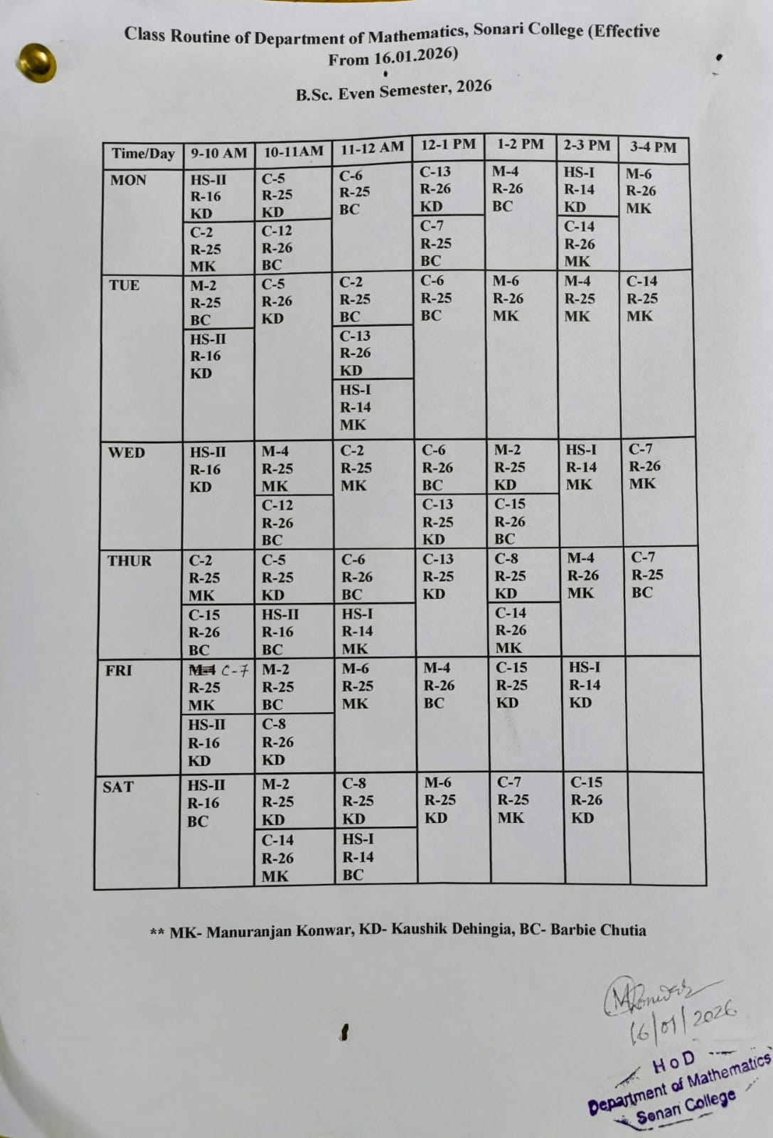 Departmental Class Routine (Even Semester w.e.f 16.01.2026)